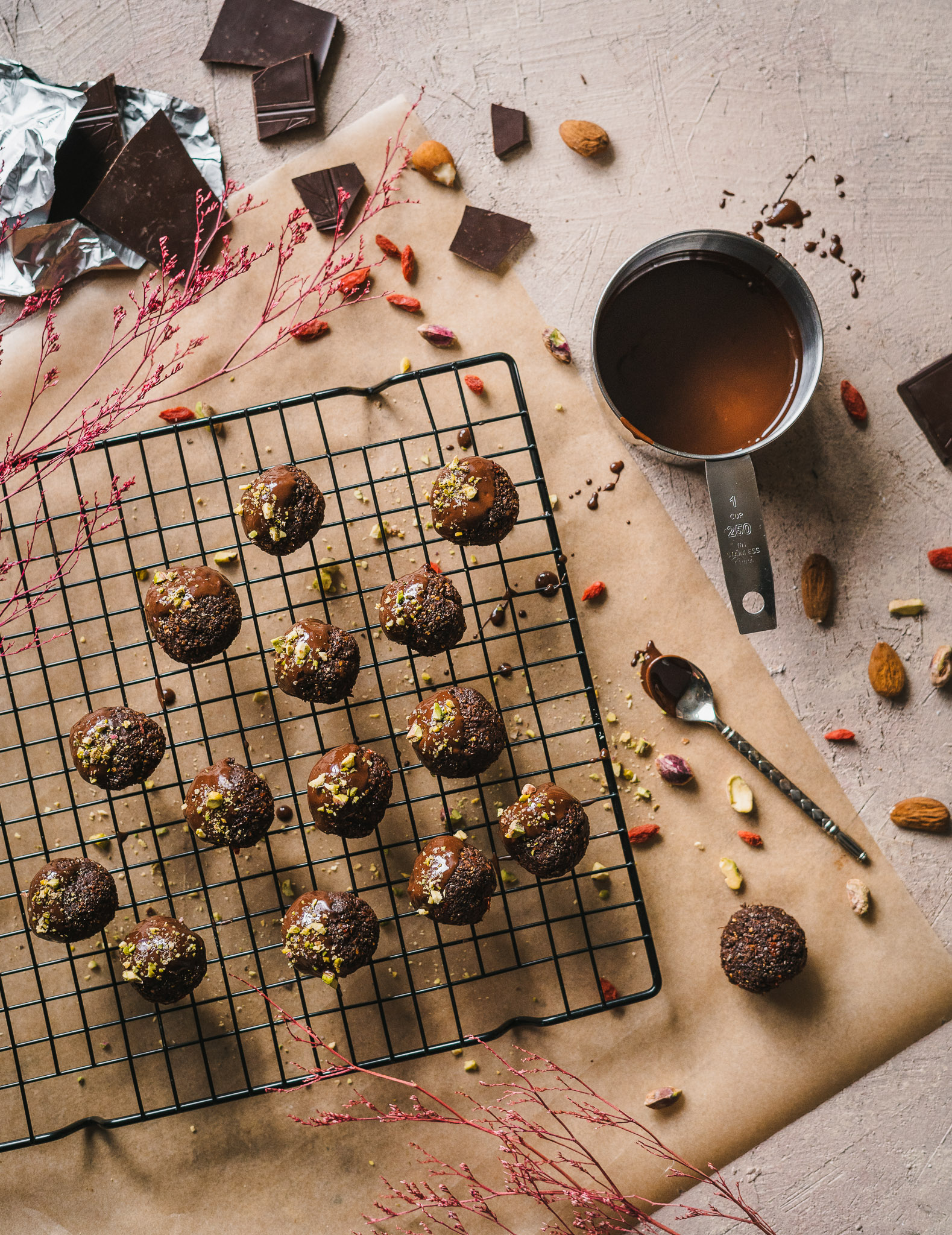 Pyszne, lekko wilgotne kuleczki, których wnętrze to samo dobro. Oblane czekoladą i posypane pistacjami, bo dobrych rzeczy nigdy nie jest za wiele.
