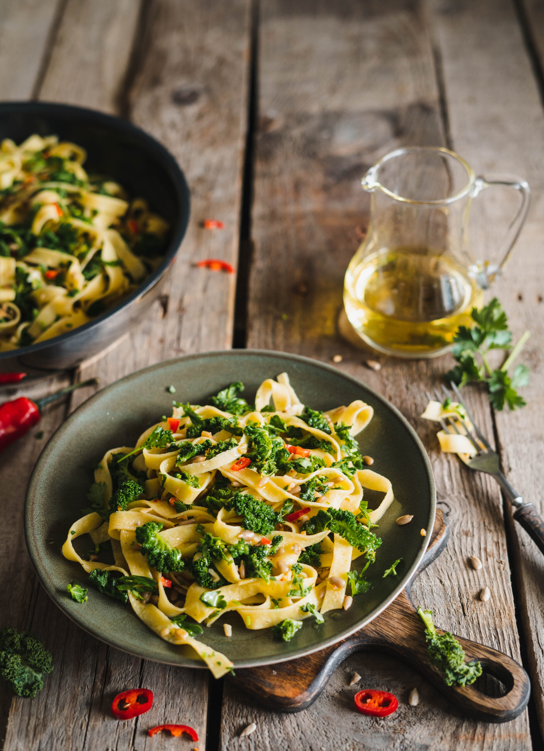 Jeśli chodzi o sam makaron użyłam wstążek fettuccine. Dzięki temu, że są grubsze, udźwigną kawałki jarmużu, a słonecznik będzie miał się do czego przylepić.