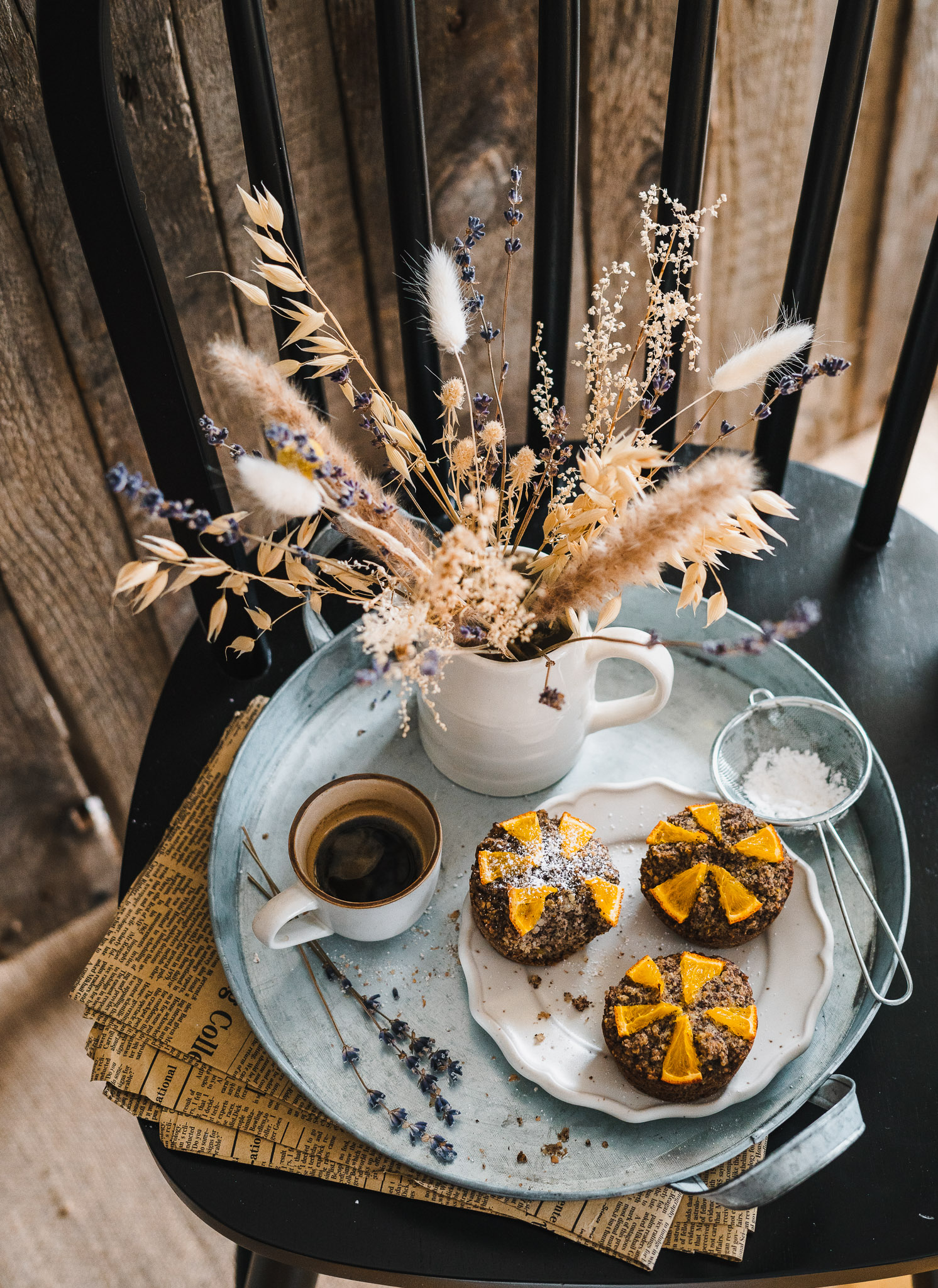 Przede wszystkim mamy tu pomarańczę i mak – duet dla siebie stworzony. Dodajemy tu sok oraz skórkę z pomarańczy co nadaje soczystości i smaku. Muffinki są dzięki temu równie pyszne świeżo po upieczeniu jak i na następny dzień. A mak nadaje przyjemną teksturę, jednocześnie łączy się cudownie ze smakiem pomarańczy. Dla podkreślenia jej charakteru, na wierzchu układamy jeszcze kawałki na wierzchu i smarujemy je syropem z agawy, co delikatnie ją karmelizuje.