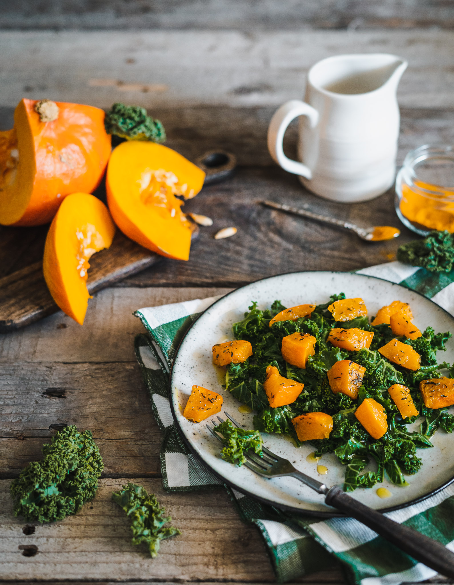 Przelany tylko wrzątkiem jarmuż, który nadal pozostaje jędrny, polany oliwą z oliwek, dla kontrastu miękka aromatyczna pieczona dynia. To co, odpalacie już piekarnik :)?