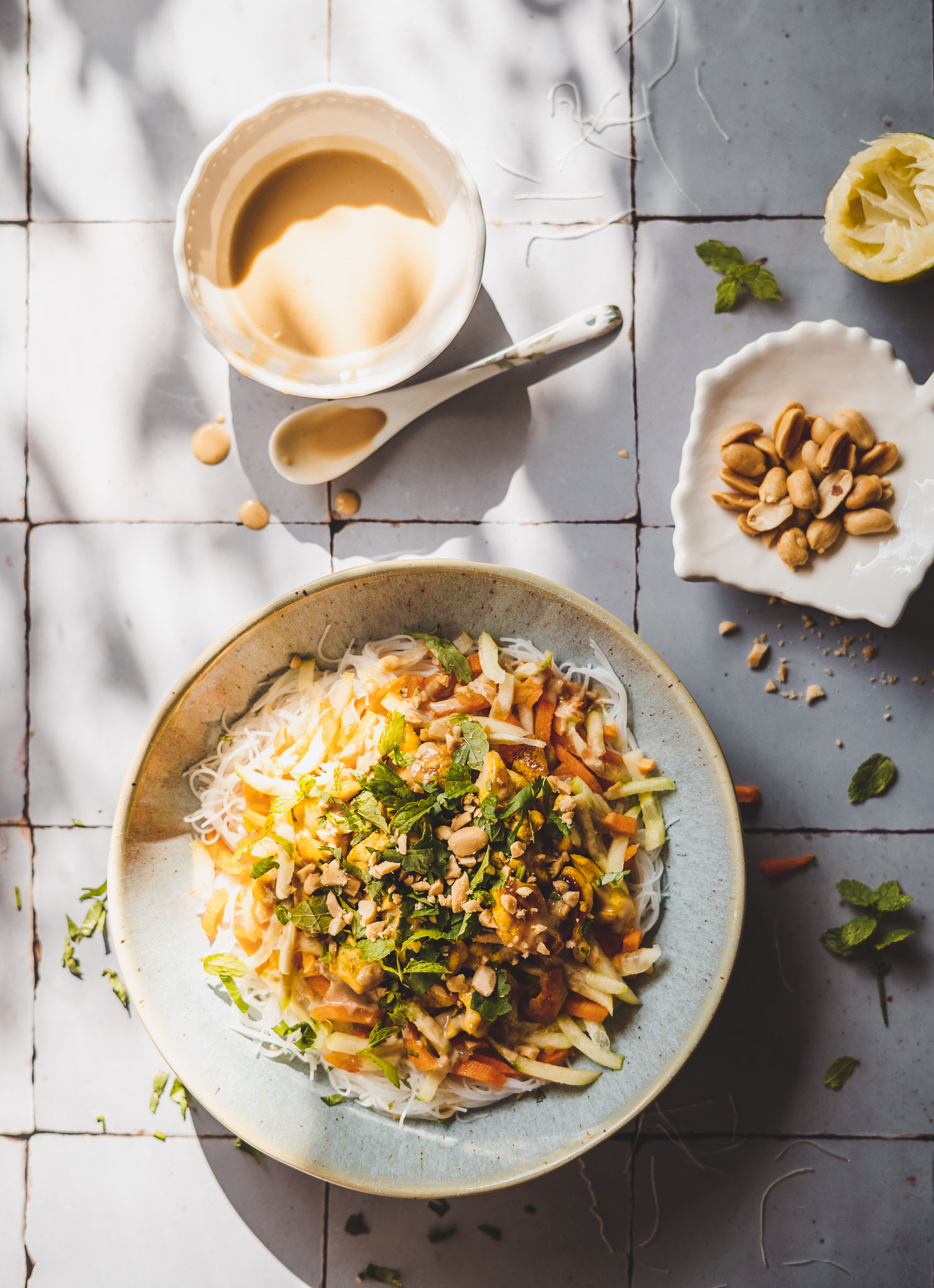 Uwielbiam szybkie, pyszne, sycące sałatki! I ta jest właśnie połączeniem wszystkich tych zalet. Azjatycki cienki makaron, który stanowi świetną bazę. Można użyć makaronu ryżowego. Jednak zdecydowanie godnym uwagi jest makaron Vermicelli – moje ostatnie odkrycie. W smaku nieróżniący się od ryżowego, a wykonany z mieszanki skrobi grochu i fasoli Mung. Rotacja zbożami jest dla mnie ważnym i służącym mi aspektem, więc wszelkie tego typu alternatywy sobie cenię! A na wierzch makaronu wykładamy resztę dodatków…