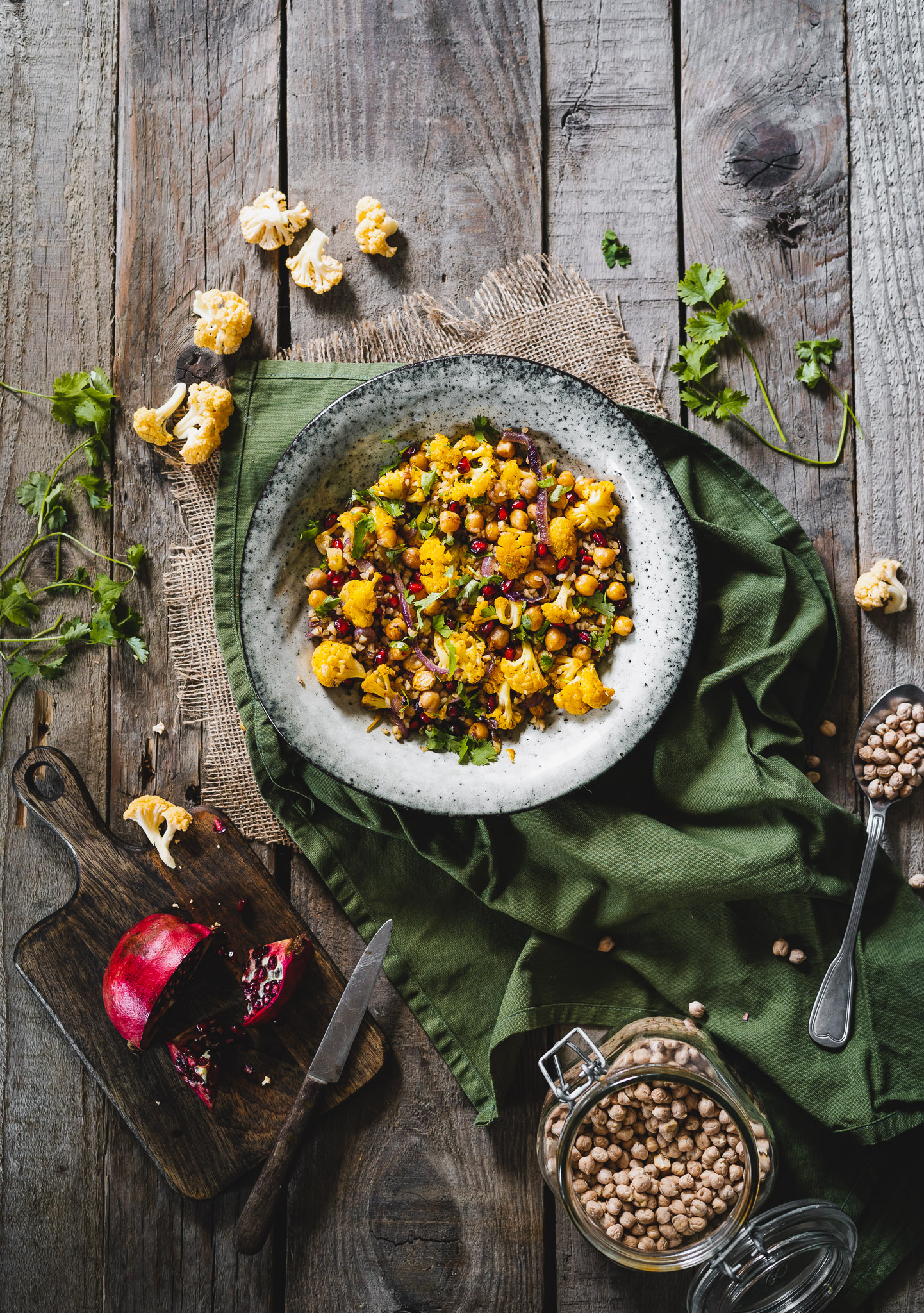 Sałatka z patelni. Sycąca, rozgrzewające danie idealne na chłodne dni. Wzbogacona o porcją białka w formie ciecierzycy, którą smażymy w aromatycznych przyprawach jak imbir, kumin i kolendra. Smaku również dodaje podsmażenie kalafiora jak i czerwonej cebulki. Sytość zapewnia kasza bulgur. A świeży granat i kolendra zwieńczają całość i nadają świeżości. To co, kto rozgrzewa już patelnię 🙂 ?